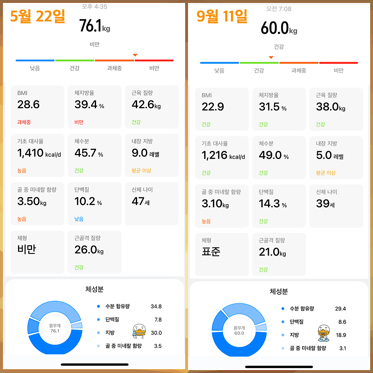 - 현재 몸무게 : 60.0 kg (총 14.7 kg 감량)